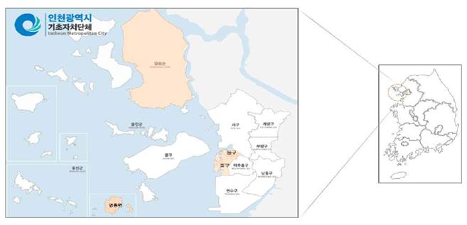 *중구 원도심 14.55㎢ + 동구 7.2㎢ + 강화 309㎢ + 영흥도 27.74㎢