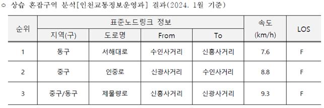 실제로 인천시 교통정보운영과가 실시한 상습 혼잡구역 분석 결과에 따르면 상습 정체 구역인 인천 중구와 동구 지역의 서비스 수준 (LOS·Level Of Service)*은 F 등급으로 교통체계 개선이 시급한 실정이며, 강화와 옹진(영흥도)은 대중교통수단이 매우 열악하고 주말 교통정체가 심각한 상황이다.