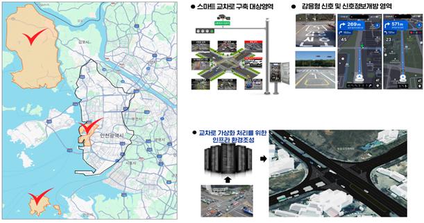 시는 제물포 르네상스 지구(중구·동구 일원)와 강화군, 옹진군 등 약 358.49㎢*에 다목적 스마트교차로(20식)와 감응형 신호제어(4식)를 구축하고 운전자를 대상으로 교통신호정보를 개방(30개소)하며, 디지털트윈 구현을 위한 기반 시설과 교통 기반 정보를 구축할 계획이다.