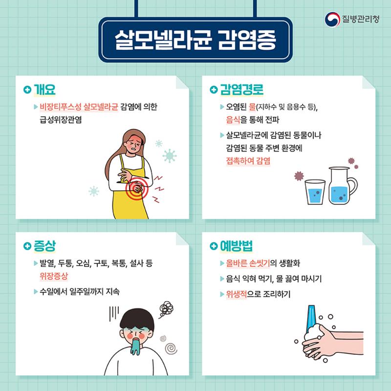 주요 증상으로는 구토·설사·복통·발열 등이 나타난다. 여름철 세균성 식중독을 예방하려면 ▲ 30초 이상 비누로 손 씻기 ▲ 식재료와 조리 기구 세척 및 소독 ▲ 물 끓여 먹기 ▲ 보관 온도 준수 ▲ 음식을 충분히 익혀 먹기 ▲ 도마, 칼 등 조리 기구를 용도별로 구분해 사용하는 등 예방 수칙을 반드시 실천해야 한다.