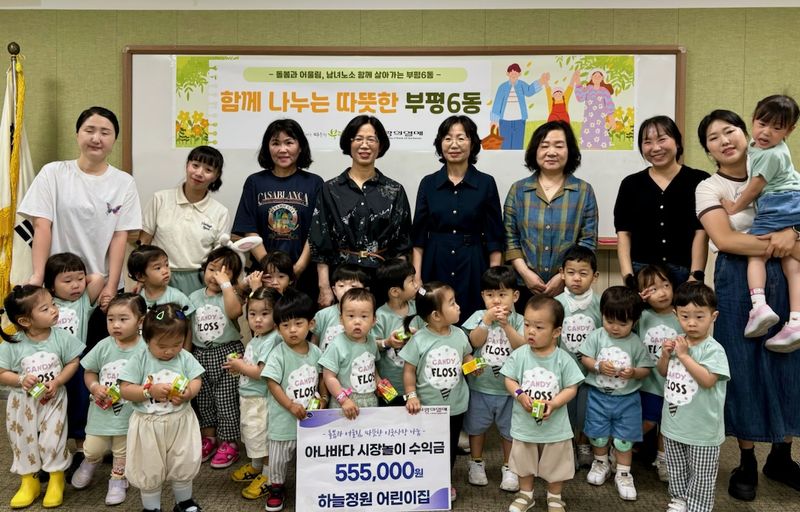 부평구(구청장 차준택) 부평6동은 지난 25일 지역 내 위치한 하늘정원어린이집으로부터 아나바다(아껴쓰고, 나눠쓰고, 바꿔쓰고, 다시쓰기) 행사 수익금 55만 5천원을 성금으로 전달 받았다.