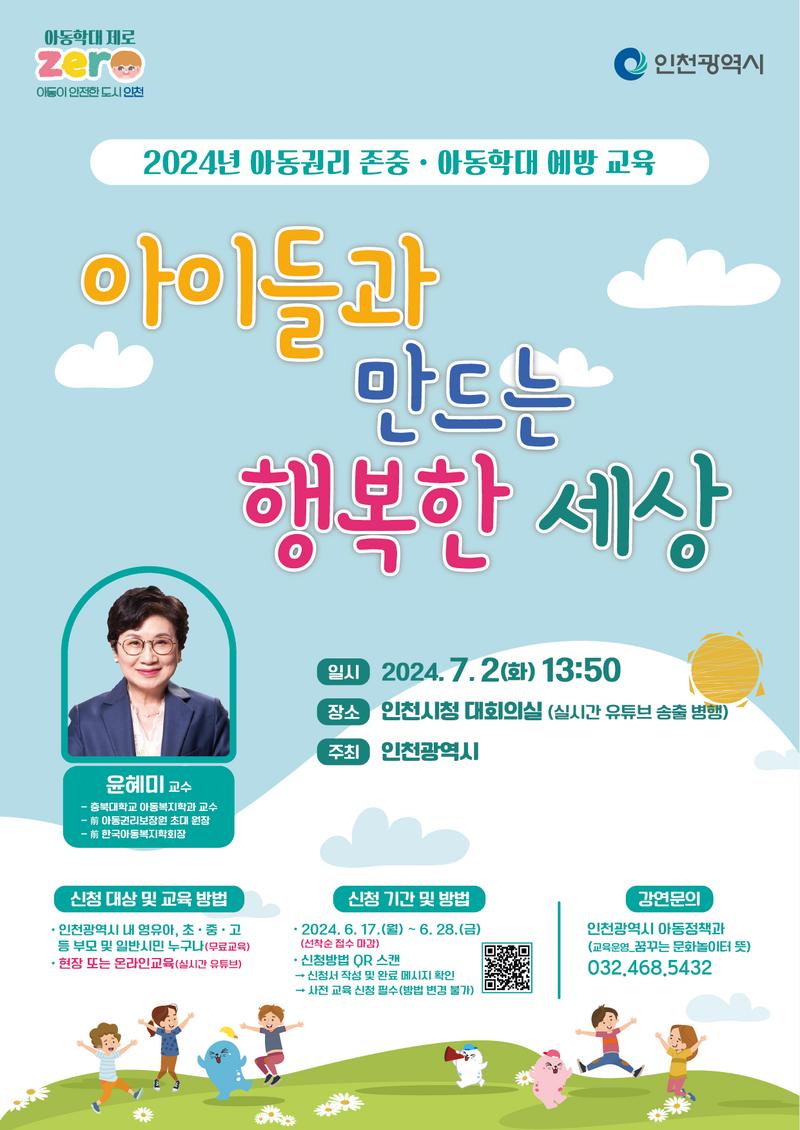 인천광역시(시장 유정복)는 오는 7월 10일 인천광역시교육청 평생학습관에서 시민과 학부모를 대상으로 ‘셰어런팅과 아동권리, 부모가 먼저 배워야 할 디지털 상식’을 주제로 아동권리교육을 진행한다고 밝혔다.