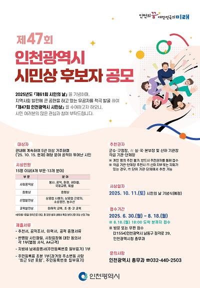 인천광역시(시장 유정복)는 지역사회 발전과 시의 명예를 높이는 데 헌신적으로 기여한 시민을 발굴하기 위해 ‘제47회 인천광역시 시민상’ 후보자를 오는 8월 18일까지 공개 모집한다고 밝혔다.