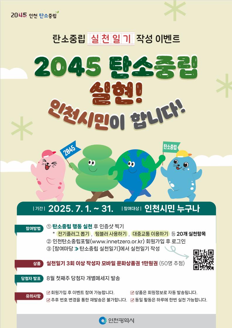 한편, 인천시는 이번 실천일기 이벤트를 비롯해 ▲범시민 탄소중립 릴레이 캠페인 ▲탄소중립포인트 100만 세대 가입 운동 ▲기후변화 교육 및 온실가스 진단·컨설팅 등 다양한 시민 참여형 프로그램을 추진할 계획이다. 이를 통해 시민 주도형 탄소중립 실천문화를 정착시키고, ‘2045 인천 탄소중립’ 실현을 위한 기반을 더욱 공고히 해나갈 방침이다.