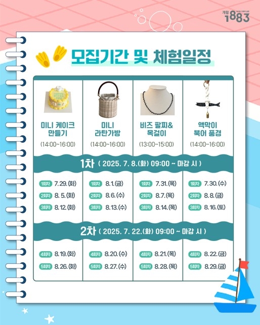 인천광역시(시장 유정복)는 시민 참여 문화를 확대하기 위해 개항장 지역 공방과 협업해 오는 7월 29일부터 8월 29일까지 ‘2025 여름특집 공방체험’을 1883개항살롱에서 운영한다고 밝혔다.