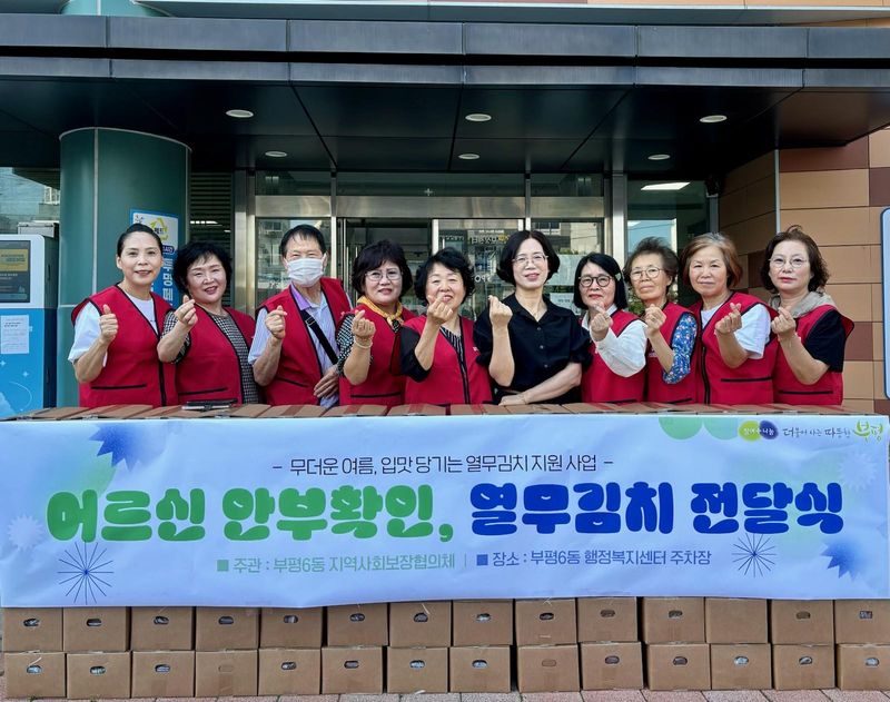 부평구(구청장 차준택) 부평6동 지역사회보장협의체는 지난 10일 저소득 홀몸 어르신 80가구를 대상으로 열무김치 나눔 행사를 진행했다.