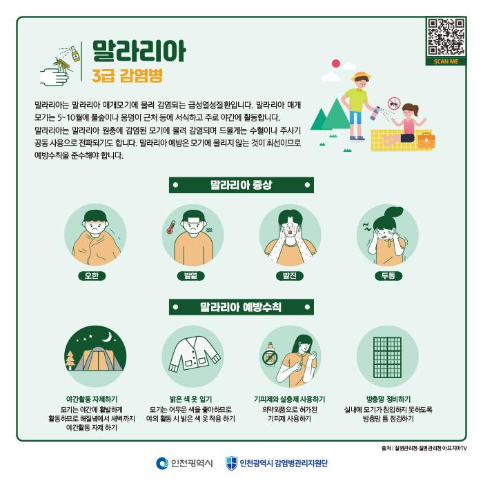신병철 시 보건복지국장은 “말라리아는 예방이 최선의 방역인 만큼모기에 물리지 않도록 예방 수칙을 실천하는 것이 중요하다”며, “야외활동 후 발열이나 오한 등 의심 증상이 있으면 가까운 의료기관, 보건소에서 신속하게 검사를 받을 것”을 당부했다.