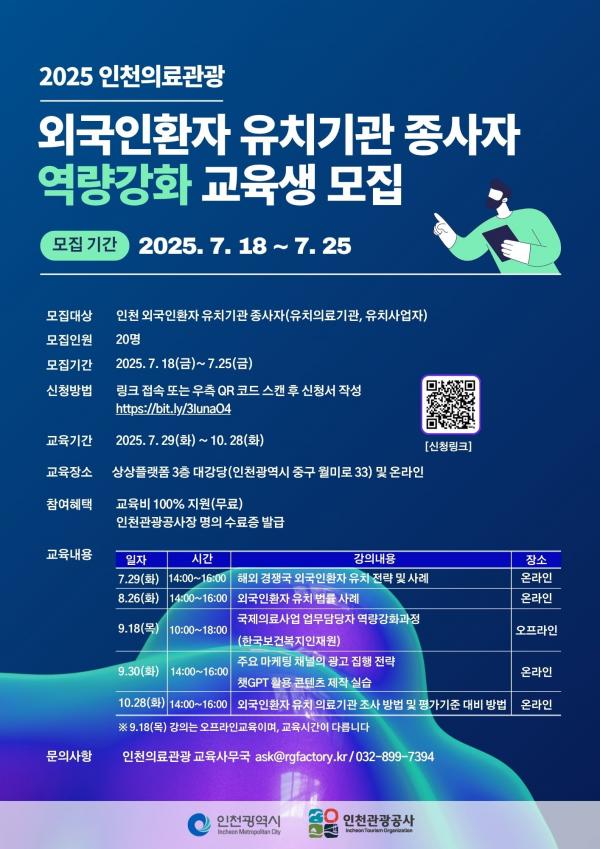 참가 대상은 인천 외국인 환자 유치기관 종사자와 인천 의료관광 코디네이터 교육 기수료자이며, 신청은 교육 모집 배너의 QR코드를 통해 온라인으로 가능하다.