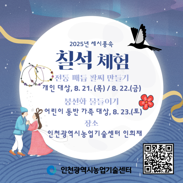 인천광역시(시장 유정복) 농업기술센터는 우리 고유의 세시풍속인 ‘칠석(七夕)’을 맞아 전통문화 체험 프로그램을 마련하고, 오는 8월 4일부터 온라인을 통해 참가 신청을 받는다고 밝혔다.