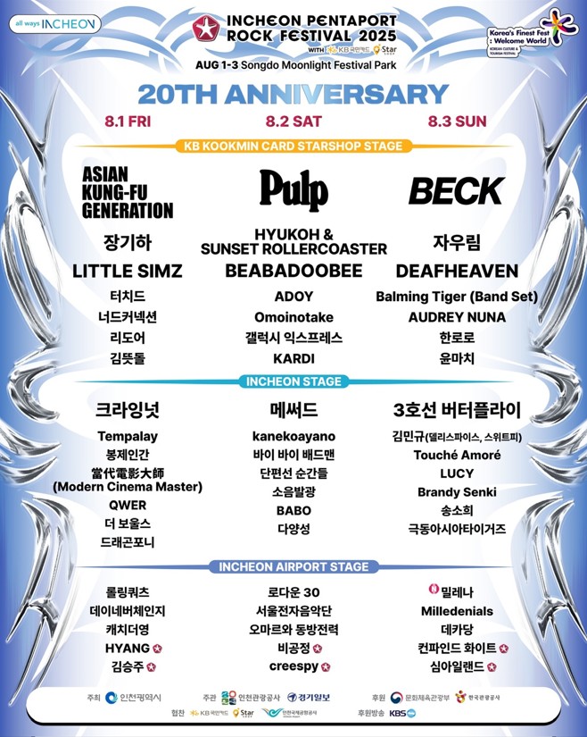 인천광역시(시장 유정복)는 인천시가 주최하고, 인천관광공사와 경기일보가 공동 주관하는 ‘2025 인천펜타포트 락 페스티벌’이 20주년을 맞아 오는 8월 1일(금)부터 8월 3일(일)까지 송도달빛축제공원에서 성대하게 열린다고 밝혔다.