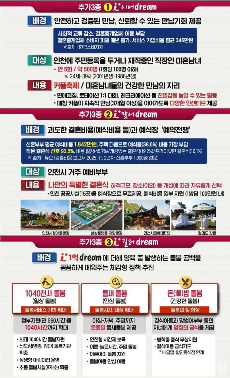 이번 사업은 인천시가 저출생 문제에 적극 대응하고 출산에서 양육까지 전 생애주기를 지원하기 위해 추진 중인 ‘아이플러스(i+) 출생정책 6종 시리즈’ 가운데 ‘아이플러스(i+) 길러드림’의 핵심 사업 중 하나다. ‘아이플러스(i+) 길러드림’은 ▲1040천사 돌봄 ▲틈새 돌봄 ▲온밥 돌봄으로 구성되어, 촘촘한 돌봄 체계를 구축해 부모가 안심하고 자녀를 키울 수 있는 환경 조성을 목표로 한다.