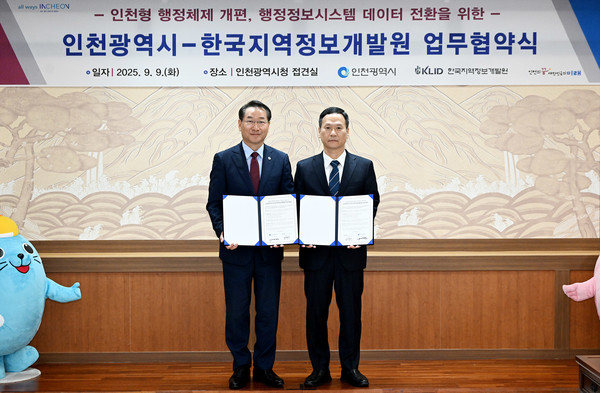 인천광역시(시장 유정복)는 9월 9일 시청 접견실에서 한국지역정보개발원 상호기관 간 업무협약을 체결했다고 밝혔다.