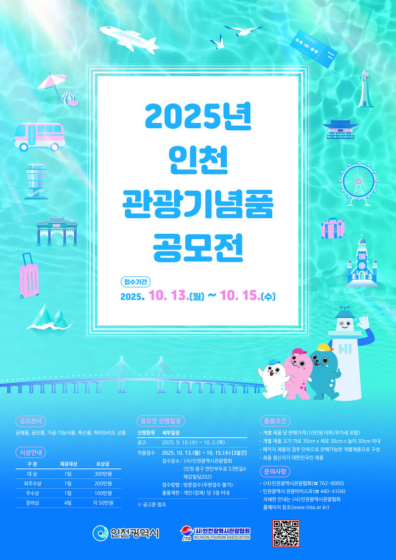 작품 접수는 오는 10월 13일부터 15일까지 3일간, (사)인천광역시관광협회(인천 중구 연안부두로 53번길 4, 해강빌딩 2층 202호)에서 진행된다. 출품을 희망하는 개인 또는 사업체는 접수 기간 내 직접 방문하여 신청서와 완제품을 제출해야 한다.