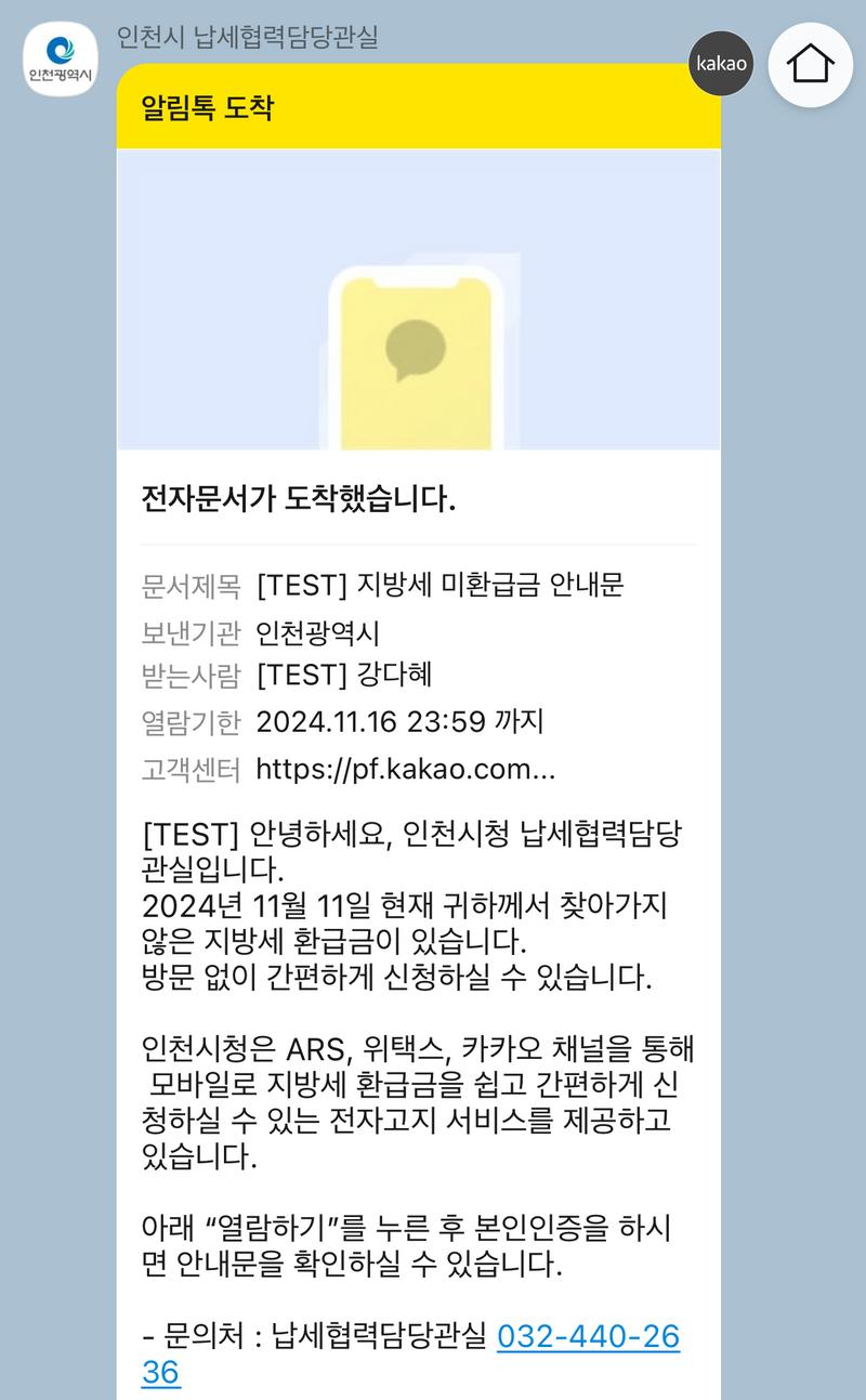 사업이 완료되면 연간 약 300만 건의 모바일 전자고지가 가능해져 시민들의 납부 편의가 크게 향상되고, 행정업무 효율도 제고될 것으로 기대된다. 특히 지방세 환급 안내를 카카오 알림톡으로 제공해, 납세자는 카카오톡 화면에서 환급 금액 확인과 신청을 간편하게 처리할 수 있다.