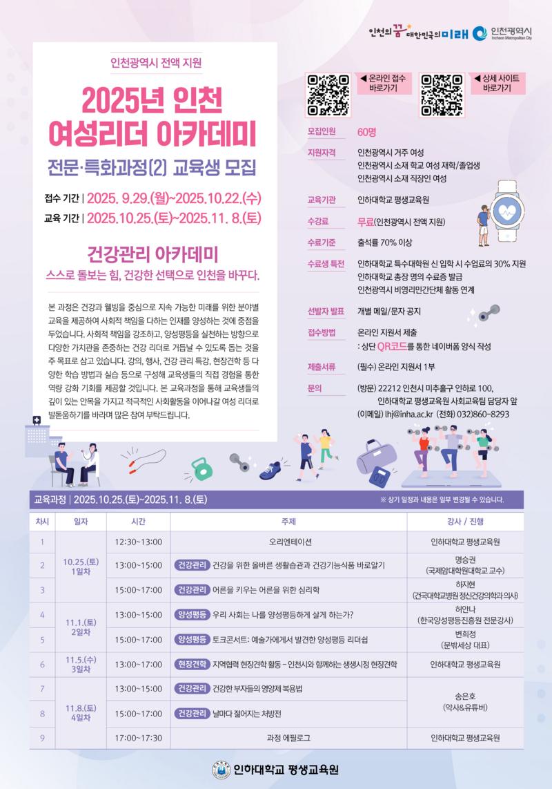 인천광역시(시장 유정복)는 역량 있는 여성 인재를 발굴하고 육성하기 위해 인하대학교 평생교육원과 함께 ‘2025 인천 여성리더 아카데미’ 두 번째 전문‧특화과정인 ‘건강관리 아카데미’ 교육생을 모집한다고 밝혔다.
