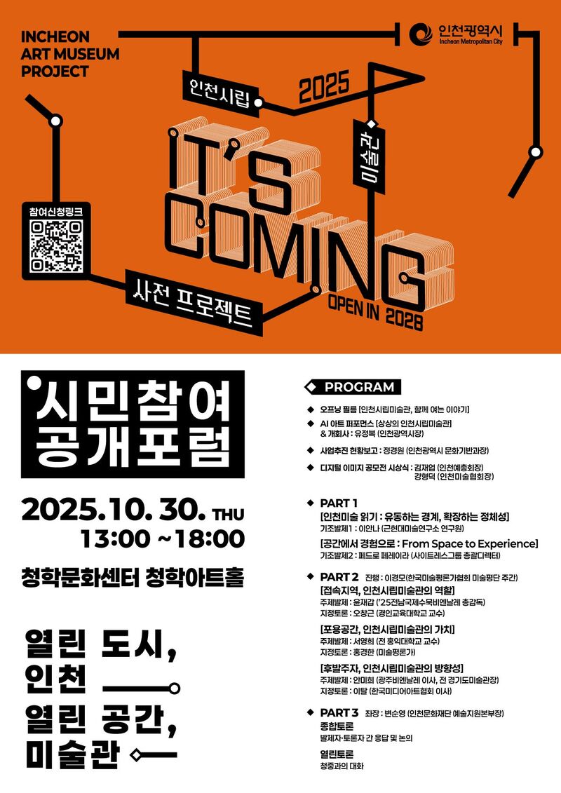 이번 포럼은 2028년 개관을 앞둔 인천시립미술관의 비전과 정체성을 시민과 함께 모색하기 위한 대표적 공론의 장이다. 올해는 ‘열린 도시, 인천-열린 공간, 미술관’을 주제로, 시민, 지역미술계, 문화예술 전문가들이 한자리에 모여 미술관의 공간적 지형과 생태계를 논의한다.