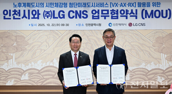 유정복 인천광역시장(왼쪽)이 22일 시청 대접견실에서 열린 '노후계획도시 시민체감형 첨단미래도시서비스 활용을 위한 인천시와 (주)LG CNS 업무협약식'에서 현신균 LG CNS 대표와 협약을 체결하고 있다.