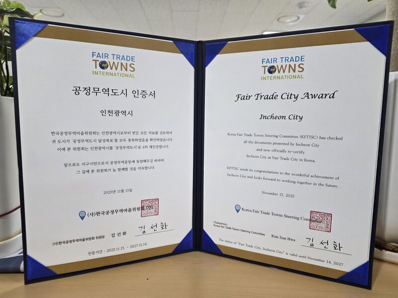 인천광역시(시장 유정복)는 지난 11월 17일 (사)한국공정무역마을위원회로부터 ‘공정무역도시 4차 재인증’을 획득하며 국내 공정무역 선도 도시로서의 입지를 확고히 다졌다.