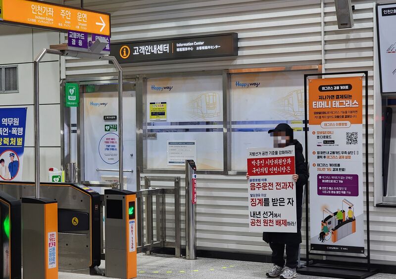 인천 서구 서부여성회관역에서 국민의힘 당원이 공천 기준 강화를 촉구하며 든 피켓