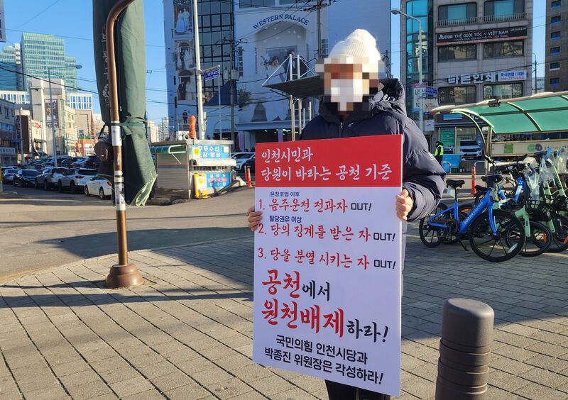 갈산역 사거리와 세월천로 사거리 인근 부평구을 당원협의회 앞에서 피켓을 든 당원 B 씨는 음주운전 전력자 공천 문제를 정당 전체의 과제로 봐야 한다고 주장했다.
