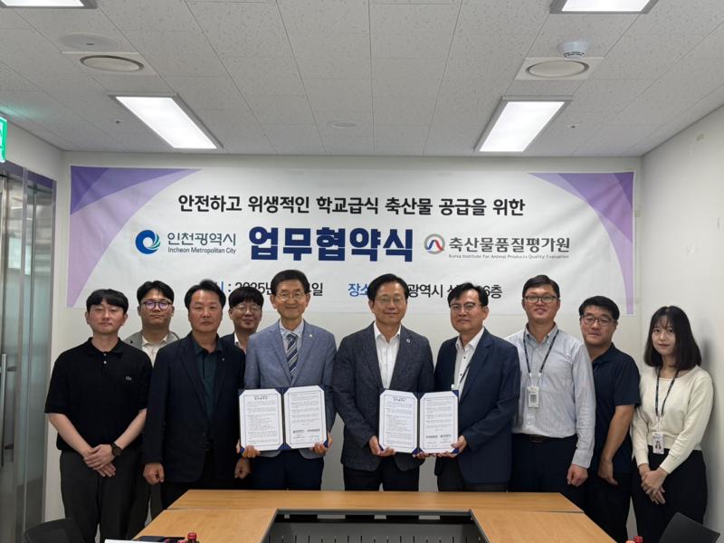인천광역시(시장 유정복)는 성장기 학생들에게 안전하고 우수한 품질의 축산물을 안정적으로 공급하기 위해 2025년도 학교급식 축산물 공급업체 선정을 완료하고, 지난 7월 4일 축산물품질평가원 서울지원(지원장 정진형, 이하 축평원 서울지원)과 업무협약을 체결했다고 밝혔다.