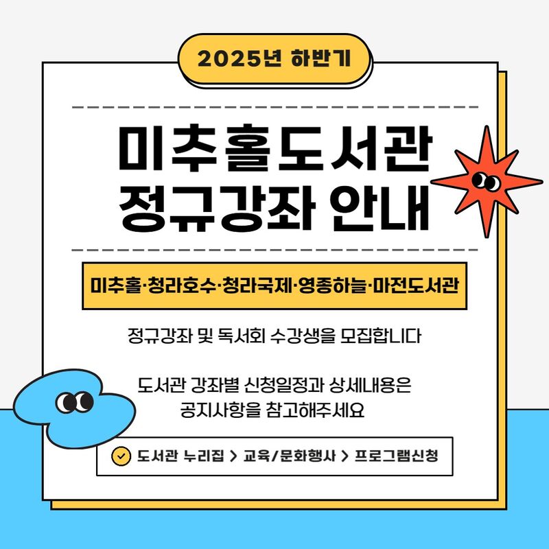 인천광역시(시장 유정복) 미추홀도서관 및 분관(청라호수·청라국제·영종하늘·마전도서관)은 오는 9월부터 2025년 하반기 정규강좌 프로그램을 운영한다고 밝혔다.
