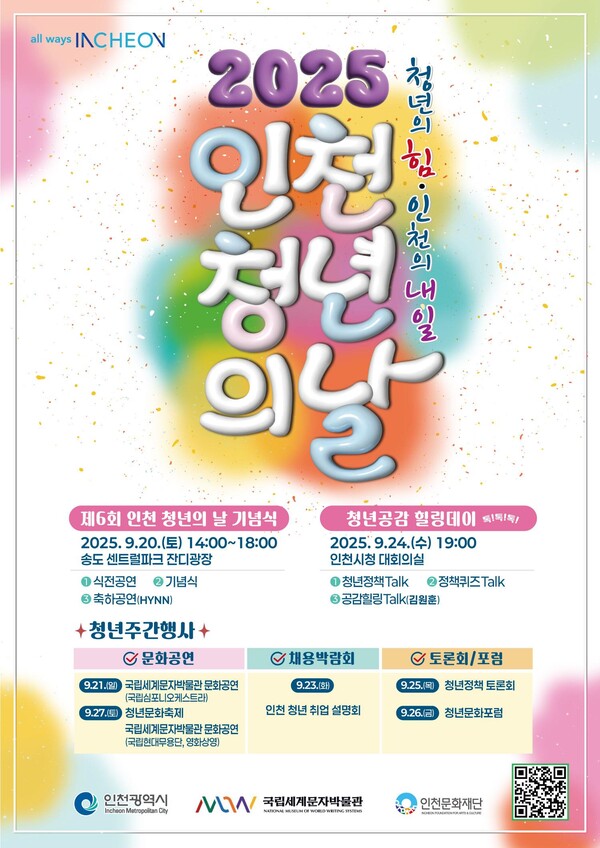 인천광역시(시장 유정복)는 9월 20일부터 27일까지 ‘2025년 인천 청년주간’을 운영하며 ‘청년의 힘! 인천의 내일’을 주제로 청년과 시민 모두가 함께하는 축제의 장을 마련한다고 밝혔다.