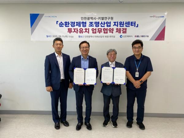인천광역시(시장 유정복)는 9월 11일 조명기술 분야 국내 최고 전문기관인 키엘연구원과 ‘순환경제형 조명산업 지원센터’ 설립을 위한 투자유치 협약을 체결했다고 밝혔다.