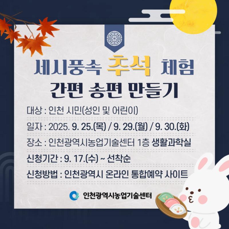 인천광역시(시장 유정복) 농업기술센터는 다가오는 명절 한가위를 맞아 시민들이 전통문화를 직접 체험하며 추석의 의미와 농업·농촌의 가치를 되새길 수 있도록 ‘추석 체험 프로그램’을 운영한다고 밝혔다.