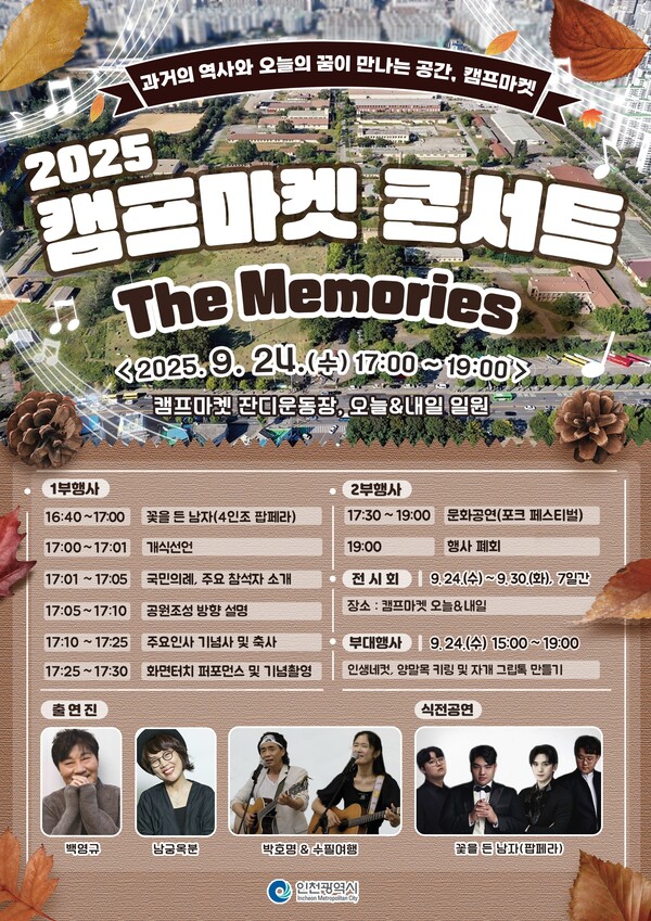 인천광역시(시장 유정복)는 오는 9월 24일 오후 5시, 부평 캠프마켓 개방공간인 잔디운동장에서 ‘2025 캠프마켓 콘서트 The Memories’를 개최한다고 밝혔다.