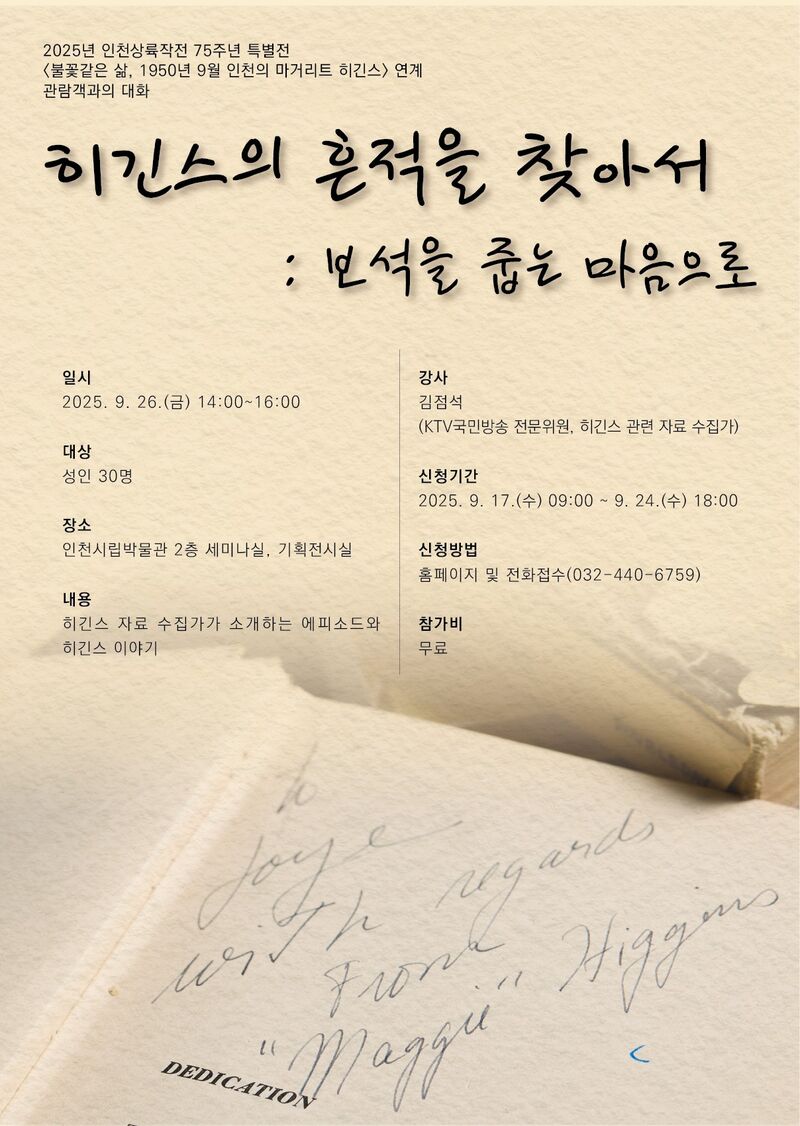 인천광역시(시장 유정복) 시립박물관은 9월 26일‘불꽃같은 삶: 1950년 9월 인천의 마거리트 히긴스’ 특별전과 연계해 ‘관람객과의 대화’ 행사를 개최한다고 밝혔다.