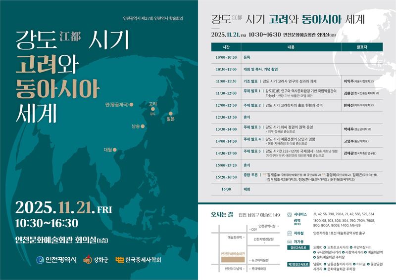 인천광역시(시장 유정복)는 제27회 인천역사 학술회의 ‘강도 시기 고려와 동아시아 세계’를 오는 11월 21일 인천문화예술회관에서 개최한다고 밝혔다.