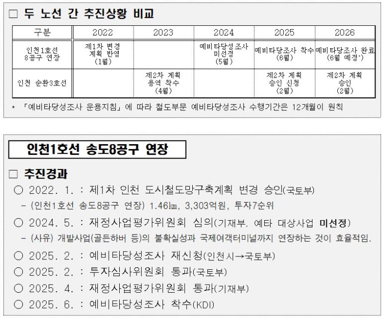 ○ ‘인천1호선 송도8공구 연장’ 사업은 ‘제1차 인천 도시철도망구축계획 변경’에 반영된 사업으로 지난 2025년 2월 예비타당성조사 대상사업으로 신청하여, 국토교통부 투자심사위원회와 기획예산처(前기획재정부) 재정사업평가위원회 심의를 거쳐 2025년 4월 예비타당성조사 대상사업으로 선정되어 현재 예비타당성조사 중인 사업임.