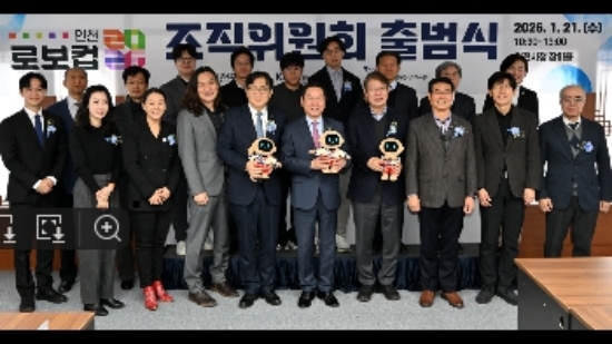 유정복 인천시장이 '로보컵 2026 인천 조직위원회 출범식'에서 김진오 한국AI·로봇산업협회장 등 참석자들과 기념촬영을 하고 있다