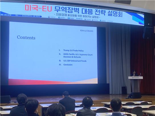 강연에서는 트럼프 행정부 관세 정책 변화와 국제무역 관련 법원의 최신 판결 동향, 글로벌 관세 환경 변화 등을 설명하고 기업의 대응 전략을 제시했다. 또한 미국 관세국경보호국의 역할과 실제 관세 집행 사례, 미국 현지 법·제도의 배경 등을 소개하며 참석자들의 이해를 돕고 글로벌 통상 환경 변화에 대응하기 위한 실질적인 실무 지식을 제공했다.