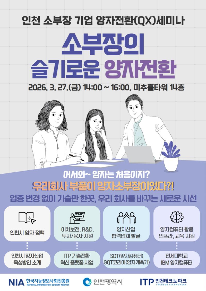 인천광역시(시장 유정복)는 3월 27일 송도 미추홀타워에서 지역 소재·부품·장비(소부장) 기업을 대상으로 「양자전환(QX) 세미나」를 열고, 양자기술 기반 산업 적용과 기업 간 협력 네트워크 구축 방안을 모색했다.