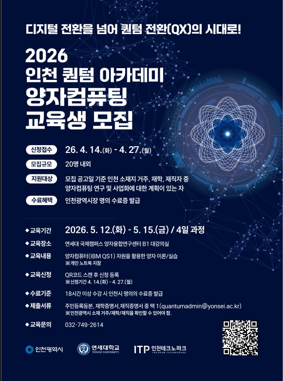 시는 연세대학교와 협력해 ‘2026 인천 퀀텀 아카데미’의 교육생을 모집한다. 이번 아카데미는 단순한 기술 체험을 넘어, 양자역학의 기초 이론부터 실무 알고리즘 설계까지 아우르는 ‘심화 집중 교육’으로 운영된다.