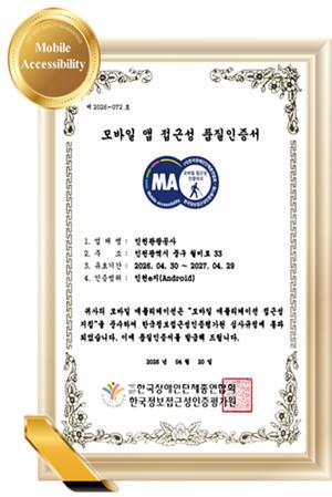 인천광역시(시장 유정복)는 스마트관광 플랫폼 ‘인천e지’ 앱(APP)이 관광약자를 배려한 서비스 구현의 우수성을 인정받아, ‘모바일 앱 접근성 품질인증(Mobile Accessibility)’을 3년 연속 획득했다고 밝혔다.