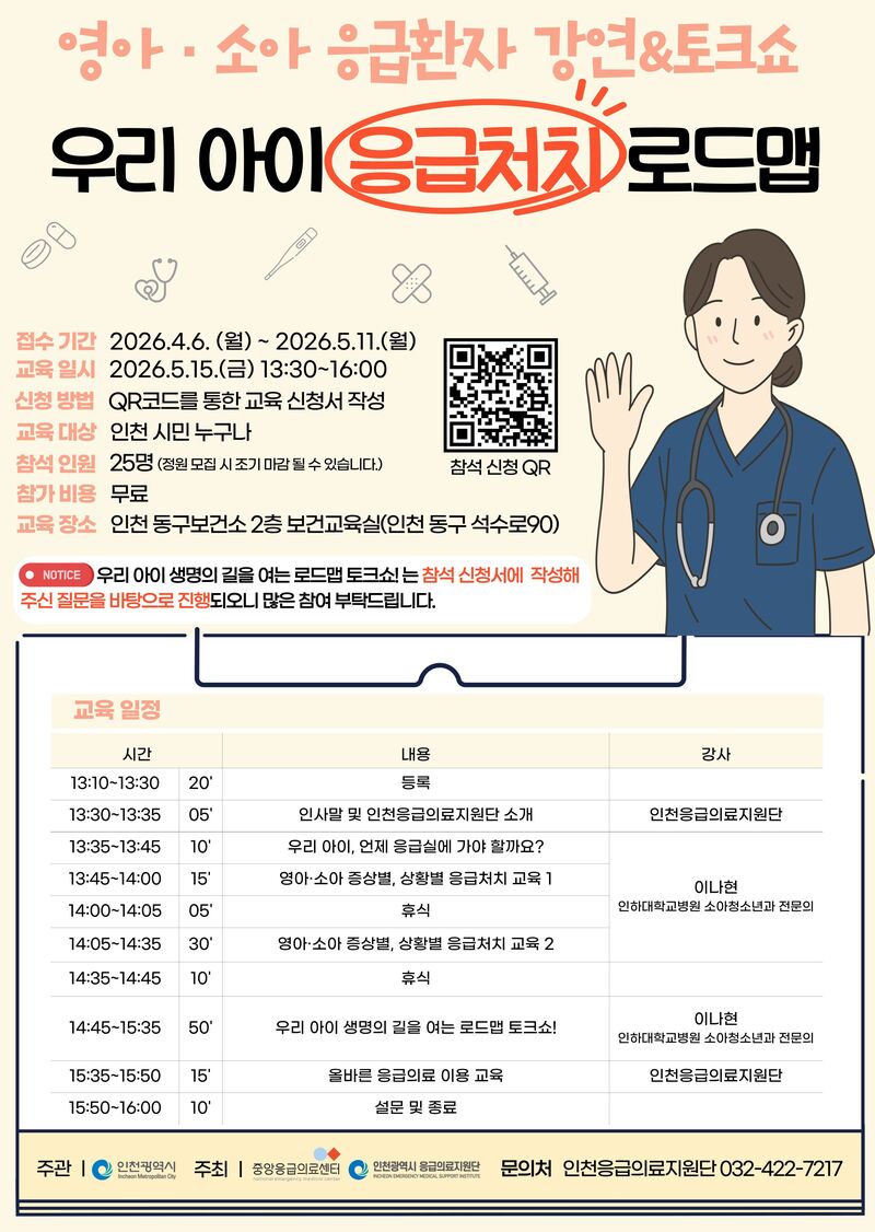 이번 강연은 인천시가 주최하고 인천응급의료지원단이 주관하며 응급의학과 또는 소아청소년과 전문의가 직접 강사로 나서 실생활에 필요한 응급의료 정보를 시민들에게 전달한다.