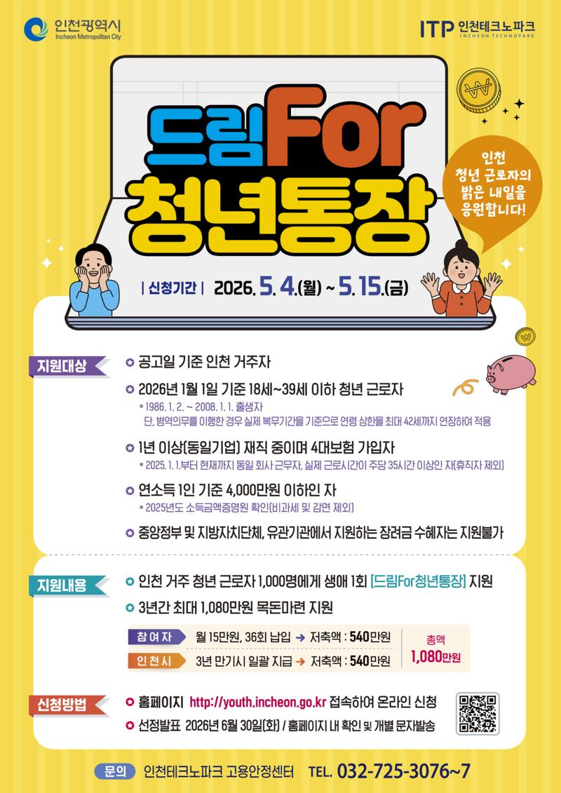 인천광역시는 청년들이 안정적으로 미래를 설계하고 목돈을 마련할 수 있도록 지원하는 ‘드림For청년통장’ 사업 참여자를 오는 5월 4일부터 15일까지 모집한다고 밝혔다.